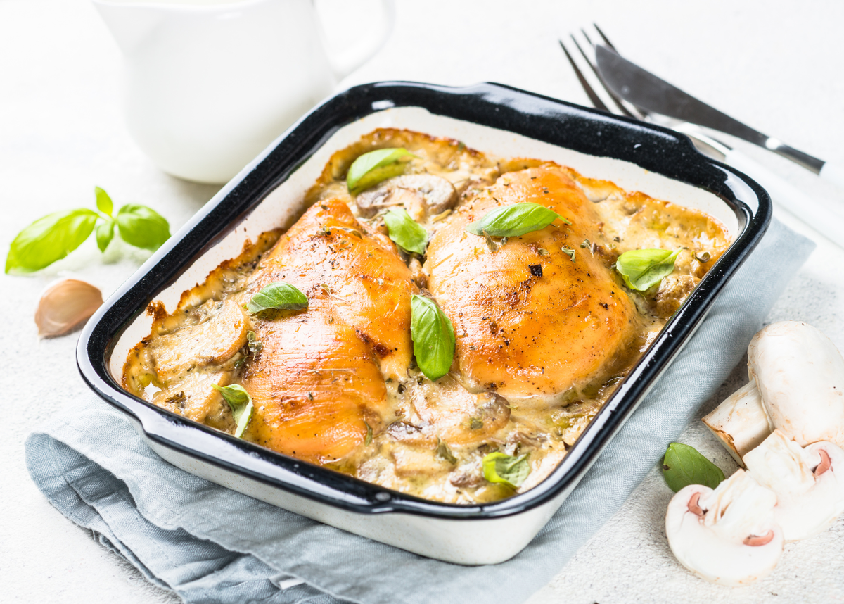 The dish starts with chicken fillet. They brown quickly before the mushrooms, garlic, Parmesan and sun-dried tomatoes create a delicious sauce in the same pan. 5 minutes in the oven. And everything is ready. Garnished with fresh basil or parsley, the dish looks great. Serve with freshly cooked pasta, rice, polenta, or crusty bread to catch the sauce.